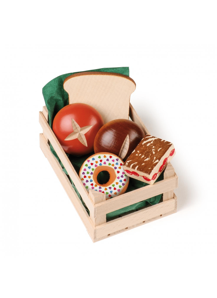This crate contains the following baked goods from coloured laquered beech wood: 1 slice of toast, 1 roll, 1 pretzel roll, 1 doughnut, 1 creamy pastry