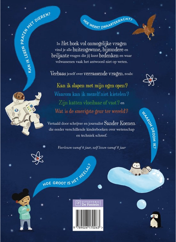 In 'Het boek vol onmogelijke vragen' vind je alle buitengewone, bijzondere en briljante vragen die jij kunt bedenken en waar volwassenen vaak het antwoord niet op weten.