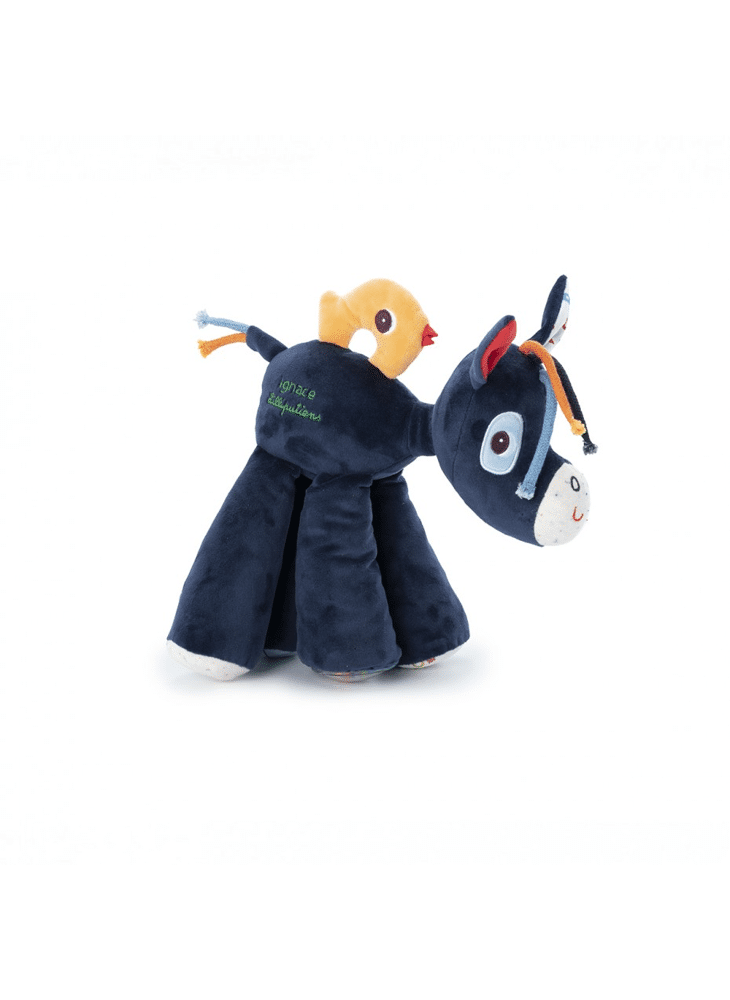 Ignace de ezel strekt zijn poten tot groot plezier van de kleintjes. Knisperen, rammelen, rinkelend belletje, …of zelf balken… Ignace is een waar festijn voor kleine oortjes