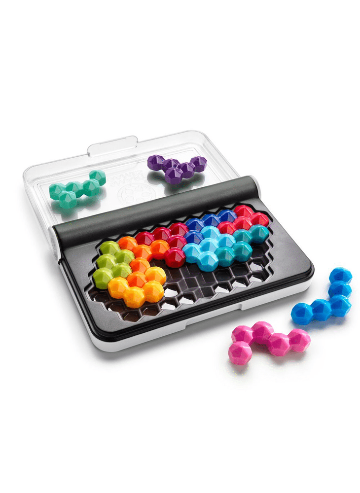 120 opdrachten in 3 verschillende spelvarianten, met 2D- en 3D-opdrachten! Vul de bovenkant met de zeshoekige puzzelstukken, bouw er driehoekige piramides, of zie kleurrijke vlinders verschijnen bij de opdrachten aan de onderkant van het speelbord. En dit alles in het vertrouwde, draagbare formaat.