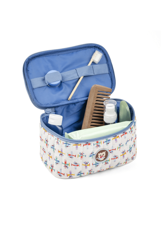 De toilettas Jules de hond is ideaal om kleintjes kennis te laten maken met avonturen buitenshuis. Vanaf 2 jaar is deze kindertoilettas een echte aanwinst dankzij de trendy blauwe kleur en vliegtuigprints, zoals “Jules the dog”. Praktisch, het geeft uw kind een gerust gevoel als hij/zij een paar nachten van huis is en het geeft hem/haar veel zelfstandigheid. Deze beautycase is geheel gemaakt van zacht en duurzaam polyester en combineert elegantie met robuustheid. Dankzij de brede ritsopening heeft elk kind snel toegang tot de inhoud: zo kan elk kind zijn of haar toiletartikelen gemakkelijk vinden! De 2 binnenvakken aan de zijkant en de 5 elastieken aan de bovenkant garanderen een optimale organisatie: tandenborstels, haarspeldjes, crèmes en tubes in alle maten vinden allemaal hun plekje. Dit model is gemakkelijk mee te nemen en beschikt over een stevig handvat met een zachte sleutelring. Met zijn afmetingen van 21 x 14 x 13 cm past dit kleine toilettasje gemakkelijk in een reistas of koffer voor op vakantie. Gemakkelijk te onderhouden: kan in de machine gewassen worden op 30°C voor een onberispelijke hygiëne, zelfs na de meest bewogen avonturen. Compatibel met de Jules weekendtas (ref. 84492), zodat u een bijpassende set kunt samenstellen voor al uw reizen!