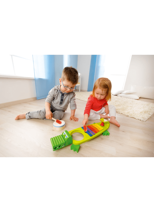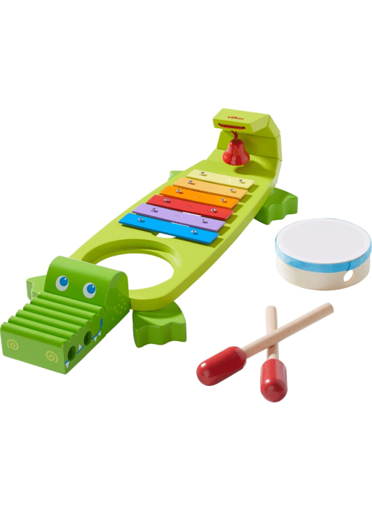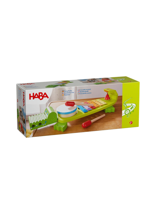 Ontdek de wereld van klanken met de kleurrijke Klang-Kroko van HABA! Dit vrolijke houten muziekinstrument in de vorm van een krokodil laat kinderen vanaf 2 jaar kennismaken met ritme, geluiden en samenwerking. Met vier verschillende geluidselementen – een metallofoon, trommel, ratel en klokje – stimuleert de Klang-Kroko de fijne motoriek, het ritmisch gevoel en de kleurherkenning.