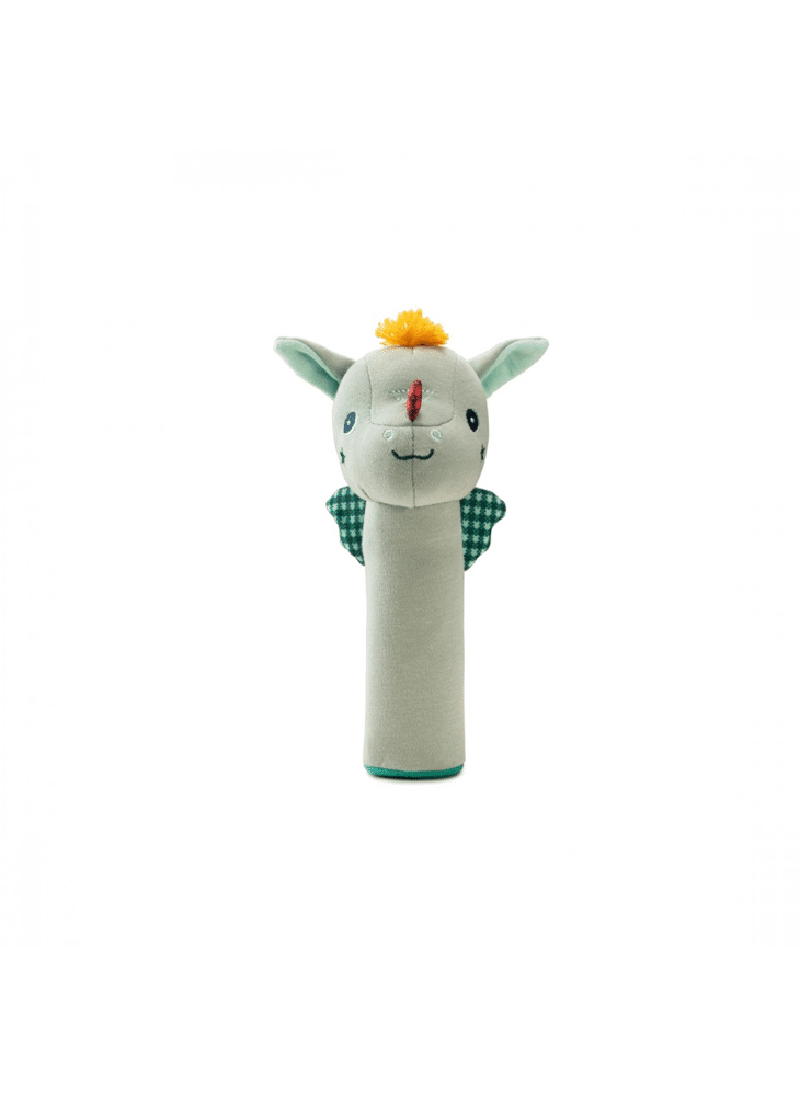 Naast een buitengewone tovenaar is Joe de draak tevens een kleine grapjas die de kleinsten aan het lachen wilt brengen. Deze knijprammelaar, naar zijn beeltenis, maakt bij de minste druk een leuk geluid om uw kleintje eindeloos te vermaken. Deze rammelaar Joe is van organisch katoen en is geschikt voor baby's vanaf 3 maanden oud.
