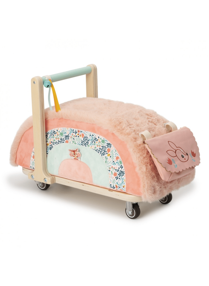 Zittend op deze zachte loopwagen, kan je kleintje veilig door de kamer racen. In het verwijderbare tasje berg je al je spulletjes op. Wordt je kindje te groot voor de loopwagen, kan de zitting verwijderd worden en dienst doen als zitje.