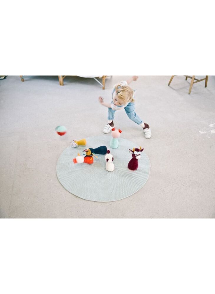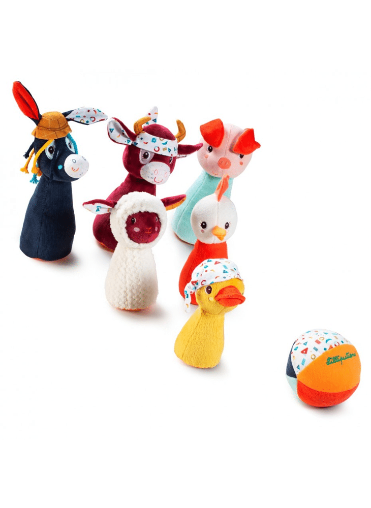 Zin in een uitstapje naar de boerderij? Met Ignace, Rosalie, Paulette, Yvon, Gaspard en het biggetje is het alsof u er echt bent. Ze wachten alleen nog op uw kleintje om plezier te maken en allen te genieten van een leuk potje bowlen! Dit pluchen kegelspel met de beeltenis van uw favoriete figuren zal uw peuter blij maken. Het spel is voorzien van een rammelballetje om de zintuigen van de baby te stimuleren. Zachte en kleurrijke kegels die uw kind met veel plezier tijdens potjes bowlen omver zullen gooien. Deze kegels zijn gemaakt van jersey en polyester.