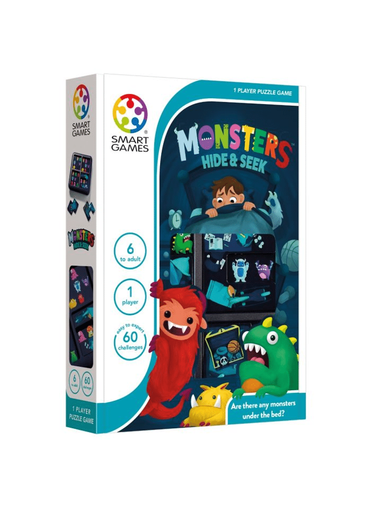 Zitten er monsters onder het bed? Plaats de 4 puzzelstukken op het spelbord, zodat alle monsters verborgen worden, behalve diegene die in de opdracht afgebeeld zijn. Monsters Hide & Seek is een reisspel met 60 opdrachten, van makkelijk tot moeilijk. Kies een opdracht en plaats de 4 puzzelstukken op het spelbord, zodat alle monsters verborgen worden, behalve diegene die in de opdracht afgebeeld zijn.