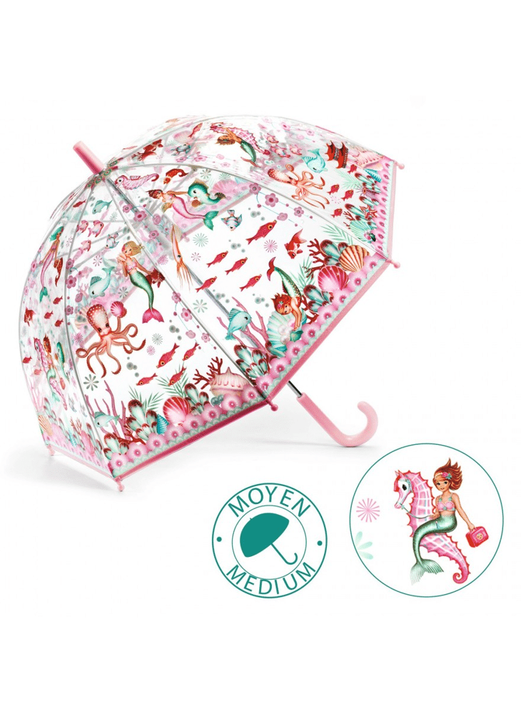 Dompel je onder in de sprookjeswereld van de zeemeerminnen met dezes stijlvolle en handige paraplu. Dankzij de handmatige opening met een beschermingssysteem kan je kind de paraplu openen en sluiten zonder zijn vingers te beknellen. Een kleurrijk accessoire, ideaal om uitstapjes in de regen op te vrolijken! Afmetingen open: 68 x 70 cm in diameter.