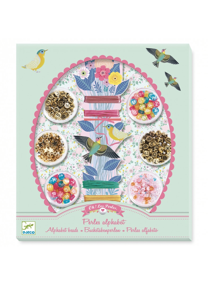 Een uitgebreide doos met een veelheid van gekleurde en gouden alfabetkralen en verschillende draden om mooie sieraden met namen of boodschappen te maken. Een goed doordacht assortiment van gekleurde houten kralen voor een harmonieus resultaat. De kinderen rijgen de kralen aan de draden om naar wens mooie armbanden, halskettingen en bedels te maken.