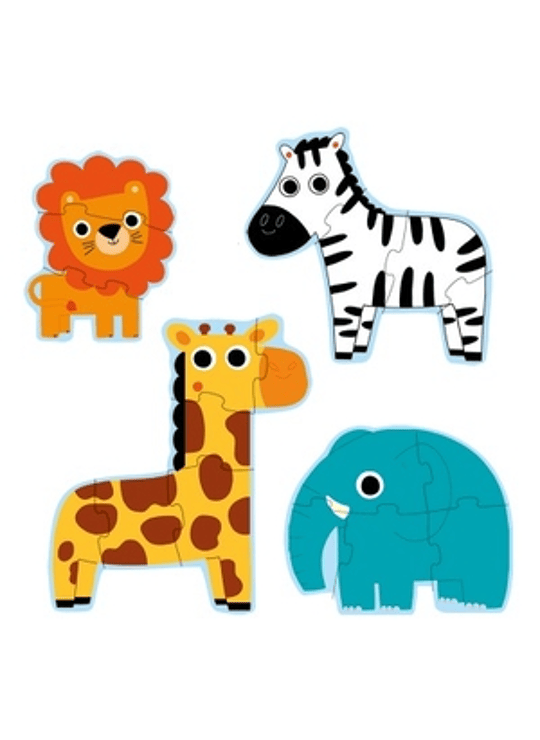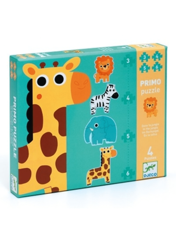 Primo Puzzle - "In the Jungle" is een set van 4 evolutieve, silhouetpuzzels van toenemende moeilijkheidsgraad met als thema de jungledieren. Een leeuw met 3 stukken, een zebra met 4 stukken, een olifant met 5 stukken en een giraffe met 6 stukken. Deze puzzels zijn speciaal ontworpen voor kinderen vanaf 2 jaar.
