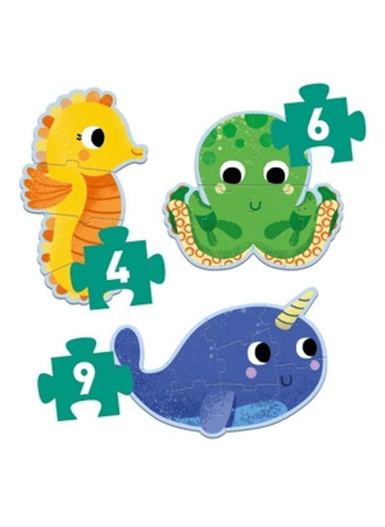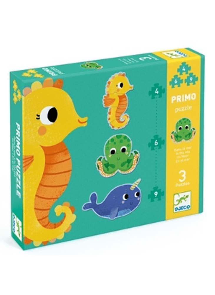 Primo Puzzle - "In de Zee" is een set van 3 educatieve silhouetpuzzels van oplopende moeilijkheidsgraad over het thema zeedieren. Een 4-delig zeepaardje, een 6-delige octopus en een 9-delige walvis. Deze puzzels zijn speciaal ontworpen voor kinderen vanaf 2 jaar.