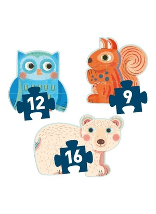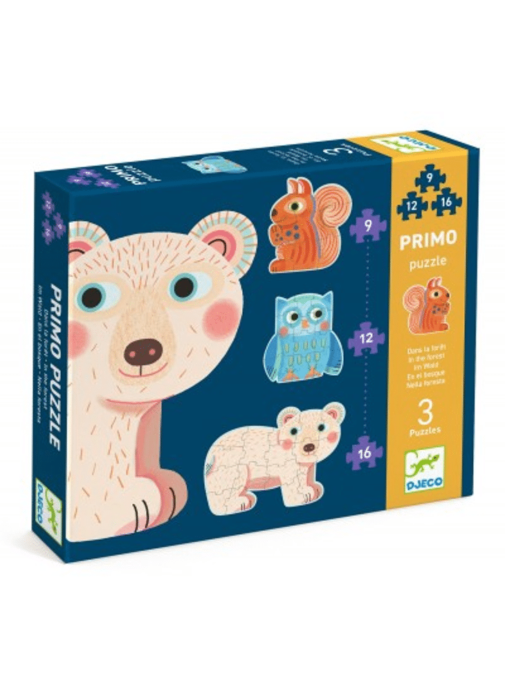Primo Puzzle - "In the Forest" is een boxset van 3 evolutieve silhouetpuzzels van toenemende moeilijkheidsgraad met als thema bosdieren. Een uil met 9 stukken, een eekhoorn met 12 stukken en een beer met 16 stukken. Deze puzzels zijn speciaal ontworpen voor kinderen vanaf 3 jaar.