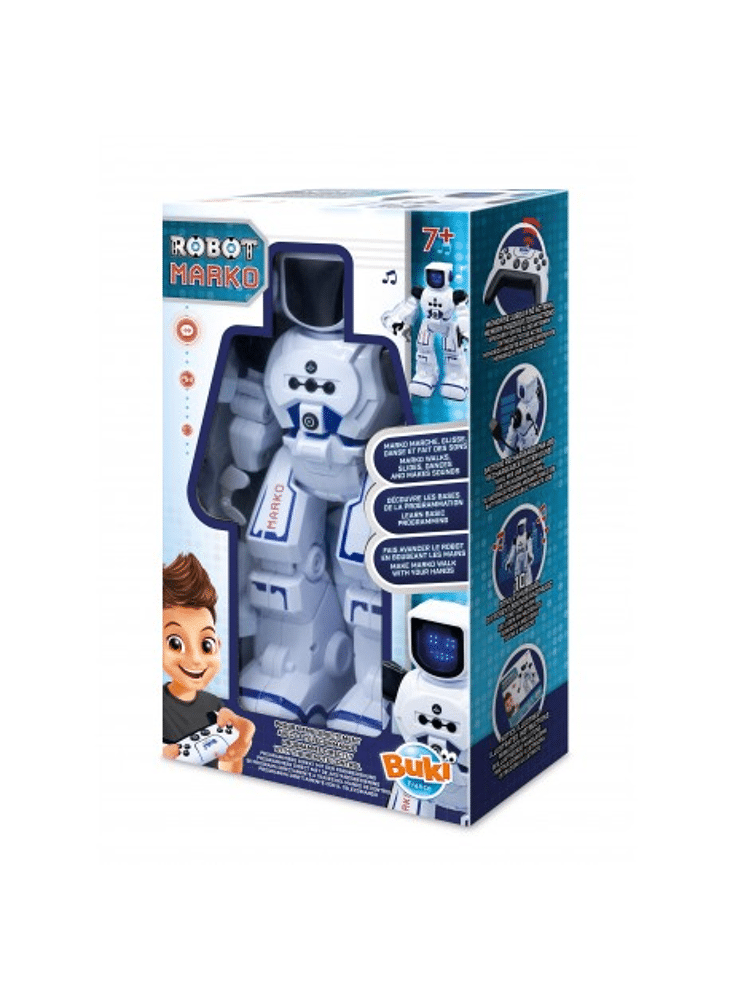 Maak kennis met Marko en zijn 20 geweldige functies: stappen, geluiden en muziekjes, dansen, emoties…Programmeer de acties van de robot met de infrarood afstandsbediening en ontdek 10 games om te leren programmeren.Afstandsbediening: vereist 2 AA-LR06-batterijen (niet meegeleverd)Robot: werkt op een oplaadbare 3,7V Li-P batterij (meegeleverd)Geïllustreerde handleiding in kleur. Vanaf 7 jaar.