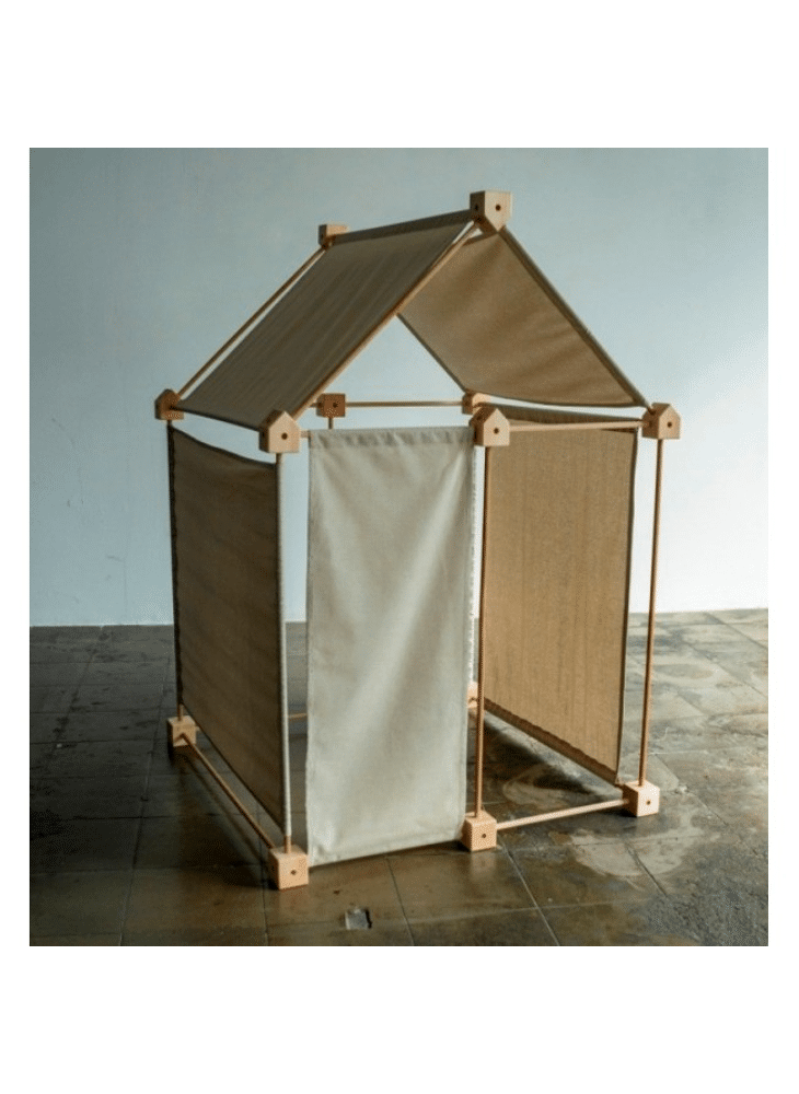 7 kubusvormige blokken van 6 x 6 x 6 cm, 7 vijfhoekige blokken van 6 x 6 x 7,5 cm, 12 stokjes, 80 cm lang, 4 stokjes, 56 cm lang, 8 stokjes, 39 cm lang, 2 stukken stof van 84 x 69 cm, 1 stuk stof van 60 x 75 cm kreema (naturel grijswitte kleur), 1 stuk stof van 83 x 49 cm kreema (naturel grijswitte kleur), 1 stuk stof van 43 x 75 cm kreema (naturel grijswitte kleur), 1 stuk stof van 83 x 33 cm kreema (naturel grijswitte kleur)
