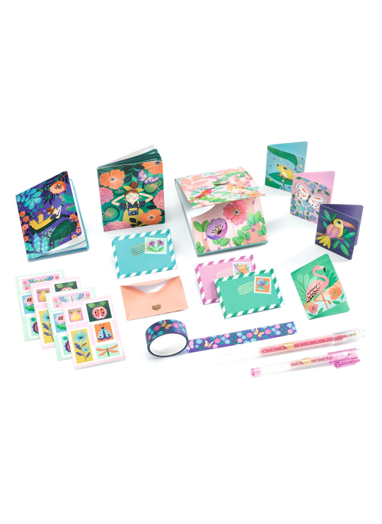 Het kastje met schrijfwaren Marie is een ware schatkamer vol creativiteit met als thema tropische tuin. Het is ontworpen als een boek dat opengaat en talrijke opbergvakken onthult, en bevat een verfijnd assortiment schrijfwaren: 2 notitieboeken, 1 blocnote, 4 kaarten, 4 enveloppen, 1 masking tape, 4 stickervellen en 2 gelpennen. Een must-have om je ideeën te organiseren en je creaties stijlvol te personaliseren.