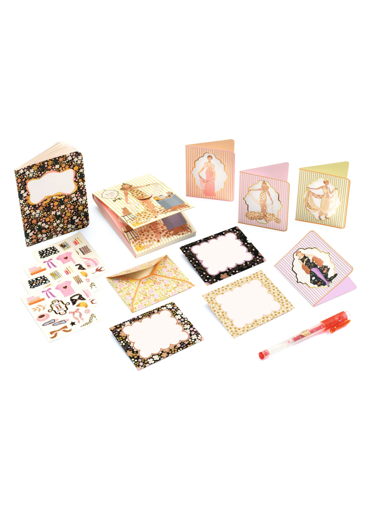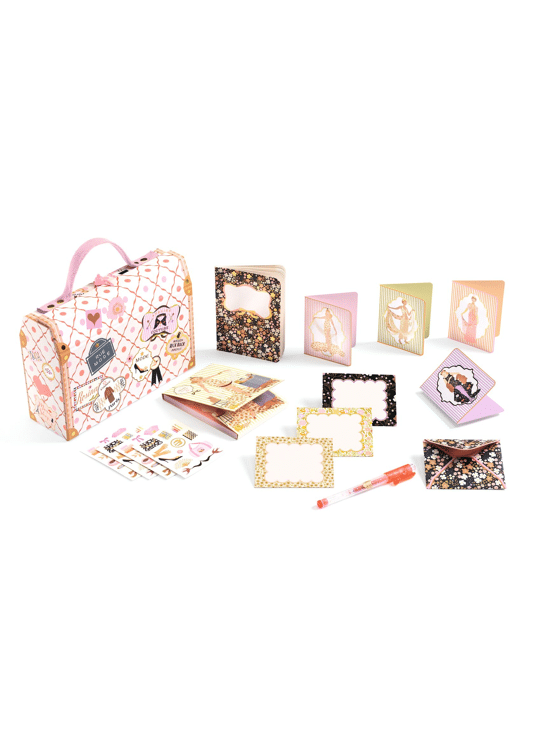 Een compleet koffertje voor al je inspiraties: notitieboekje, blocnote, gelpen, enveloppen en uitnodigingskaarten.