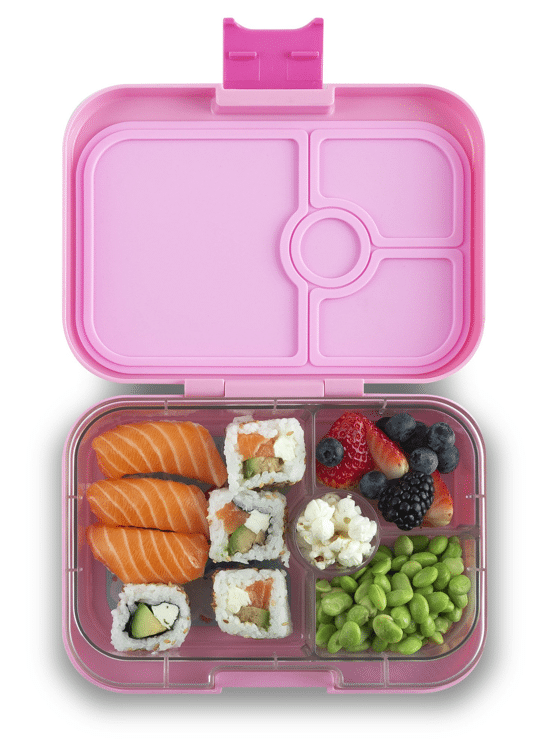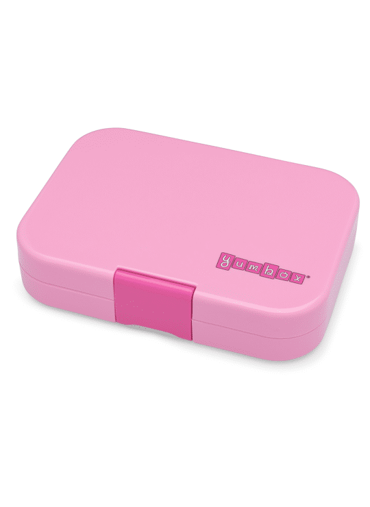 De Yumbox Panino bento lunchbox is lekvrij vanwege de siliconen afsluiting tussen de compartimenten en heeft een tray met 4 secties: een groter compartiment voor een kleine sandwich of snacks, twee kleinere delen voor groente, fruit of yoghurt en een klein rond compartiment voor nootjes of een dipsaus.