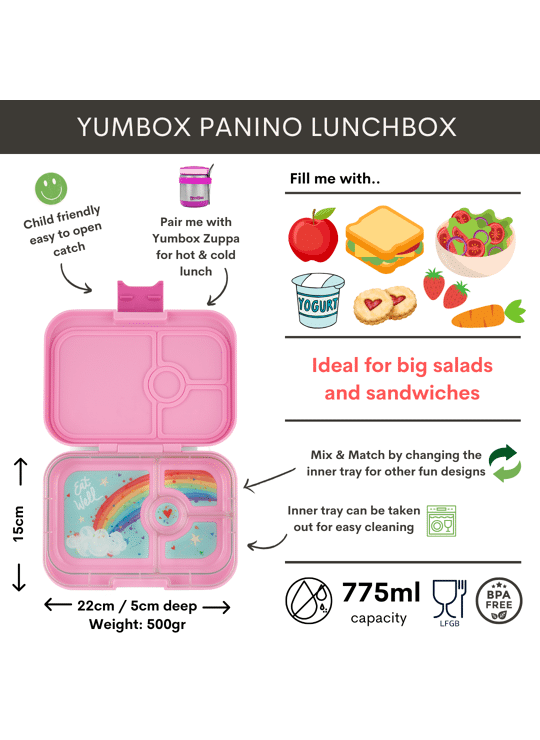 - Product: Yumbox Panino - Lekvrije Bento Lunchbox - 4 vakken - Power Pink / Rainbow tray