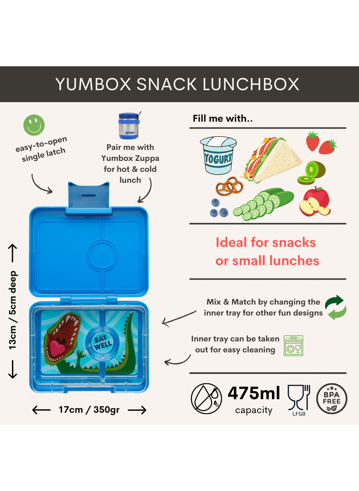 Yumbox Snack - Lekvrije Bento Lunchbox - 3 vakken - Blauw / Dinosaur tray