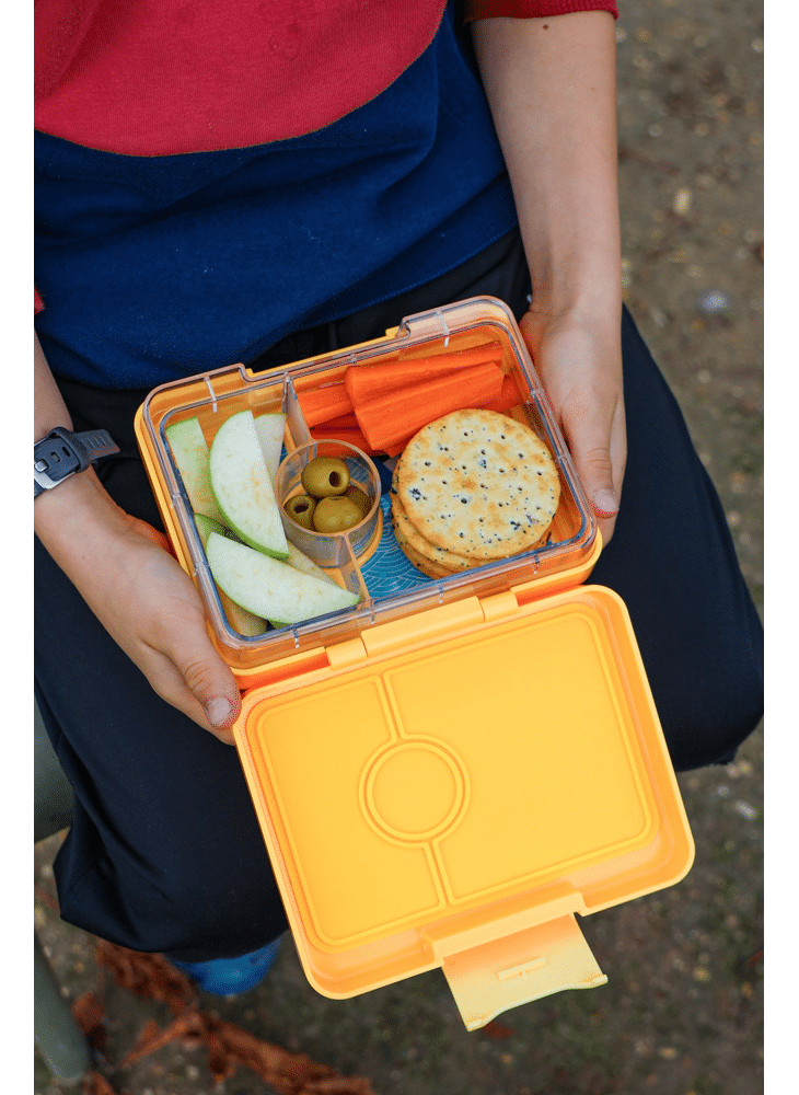 De Yumbox Snack bento lunchbox is lekvrij vanwege de siliconen afsluiting tussen de compartimenten en heeft een tray met 3 secties: een groter compartiment voor een kleine sandwich of snacks, een kleiner deel voor groente, fruit of yoghurt en een klein rond compartiment voor nootjes of een dipsaus.